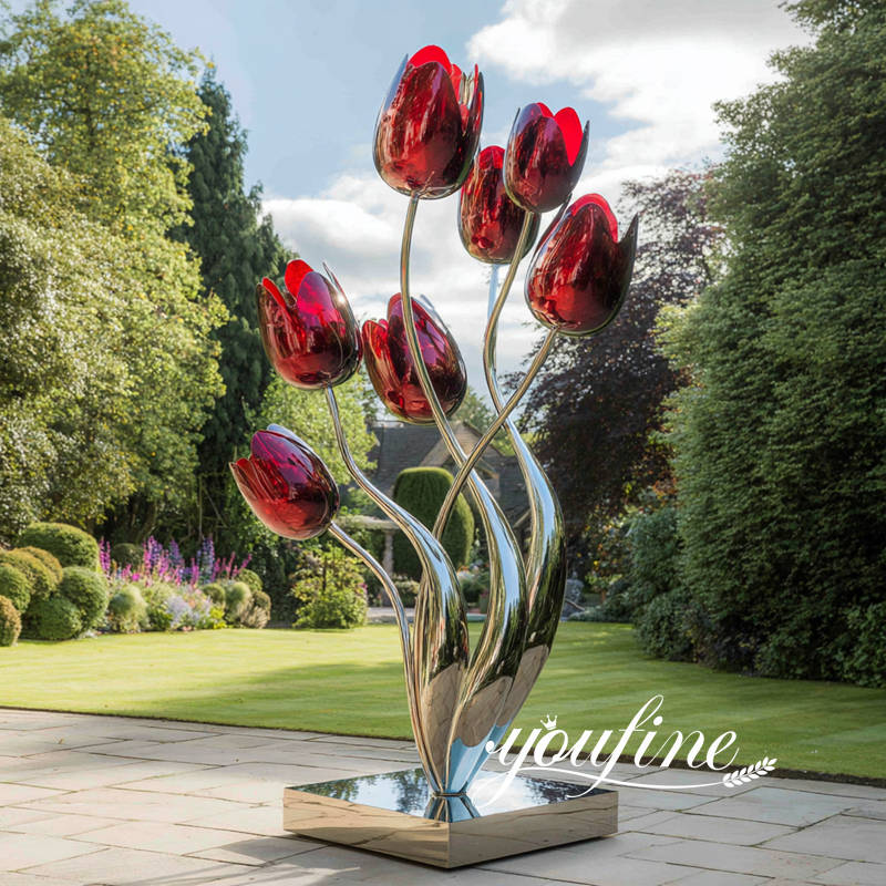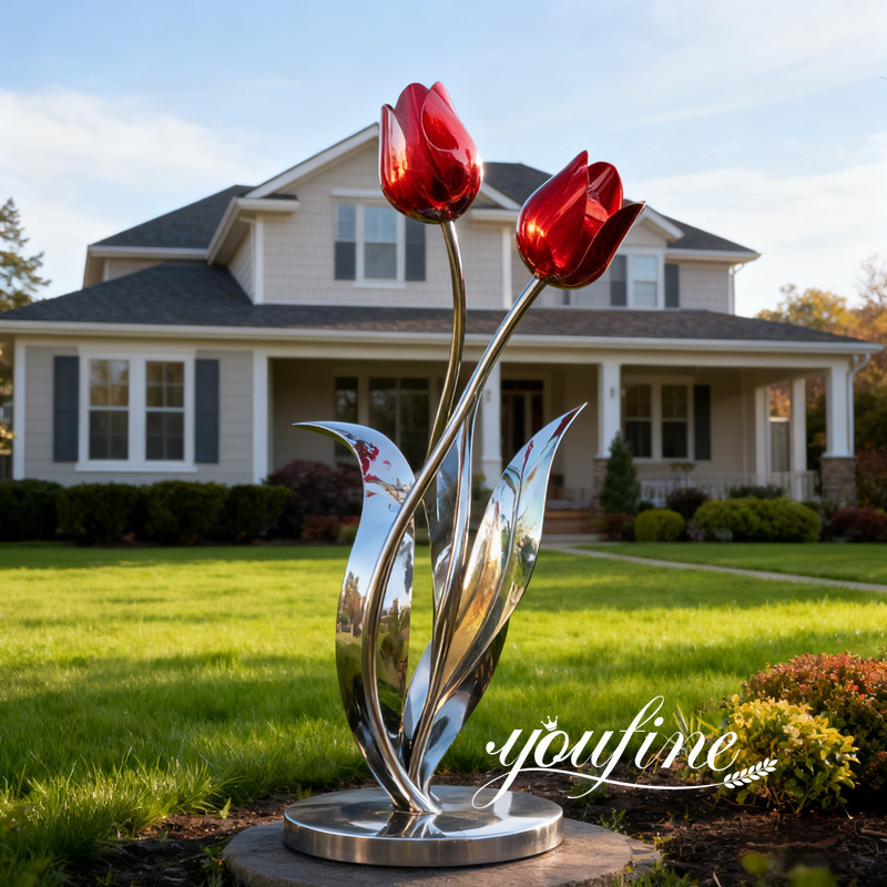 The tulip sculpture with red flowers and a modern finish brings elegance and a romantic touch to your garden. The silver and red finish match well with the lawns and natural scenery.