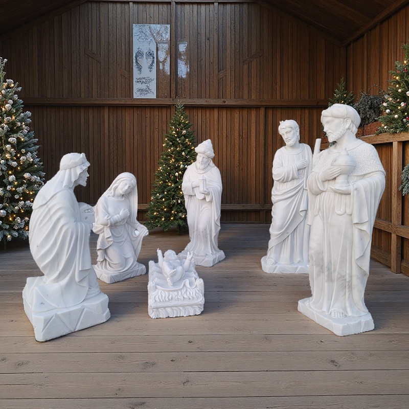When choosing materials for outdoor Nativity statues, durability and aesthetics are key. Two popular materials are resin and marble: