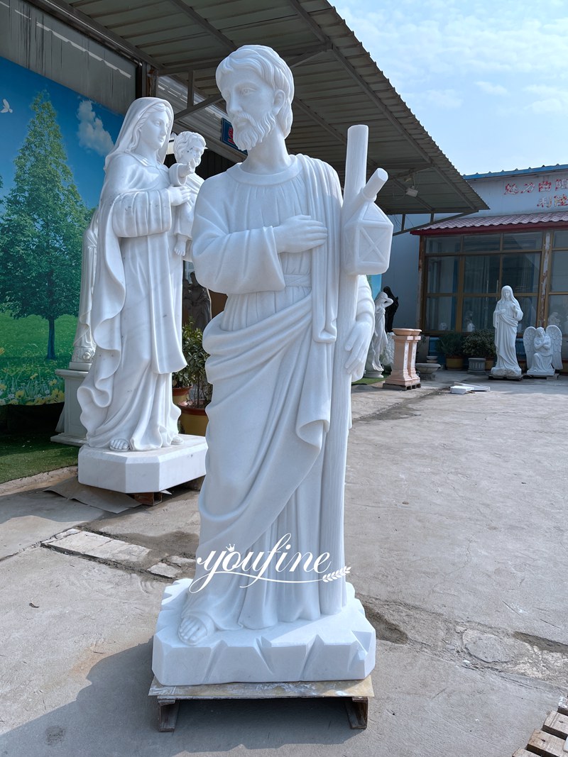 Joseph, Mary’s husband and the earthly father of Jesus, is often portrayed standing near Mary, holding a staff or lantern, symbolizing his role as a protector.