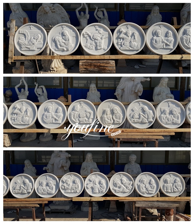 The 14 Stations of the Cross marble reliefs were hand-carved based on drawings provided by the client, maintaining accuracy and detail.