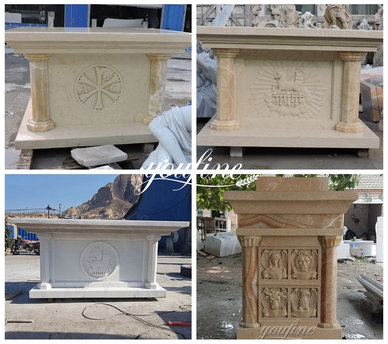For the marble altars, pulpits, and baptistery, the artists meticulously followed size requirements, ensuring deviations were within 5 mm. Custom logos and intricate details on these pieces were also hand-carved.