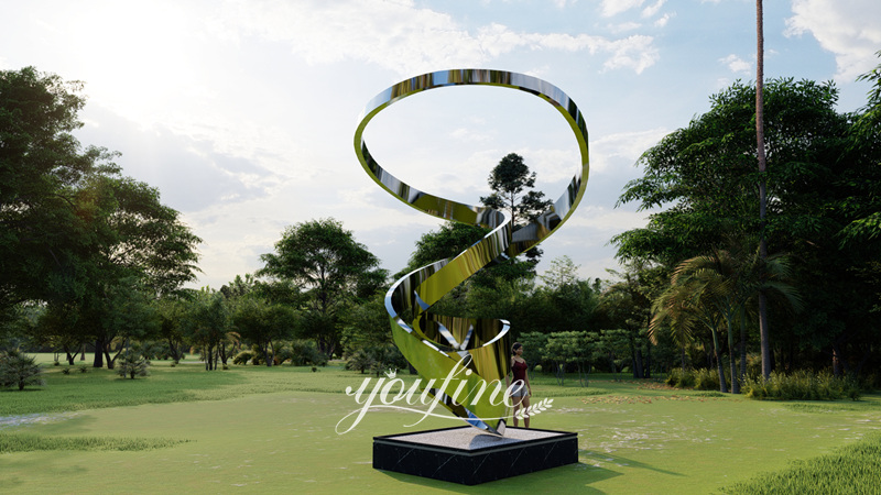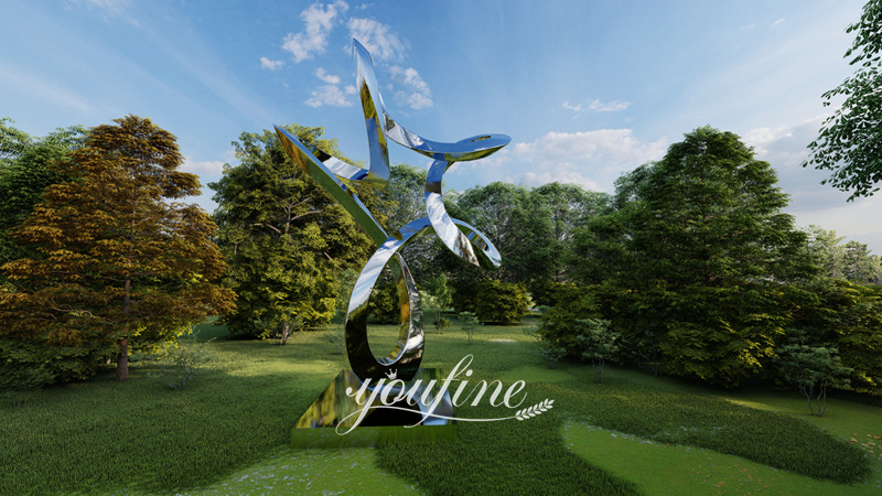 This stainless steel ribbon sculpture has smooth and modern curves. The finish was highly polished and reflective, making it a striking addition for lawns and parks.