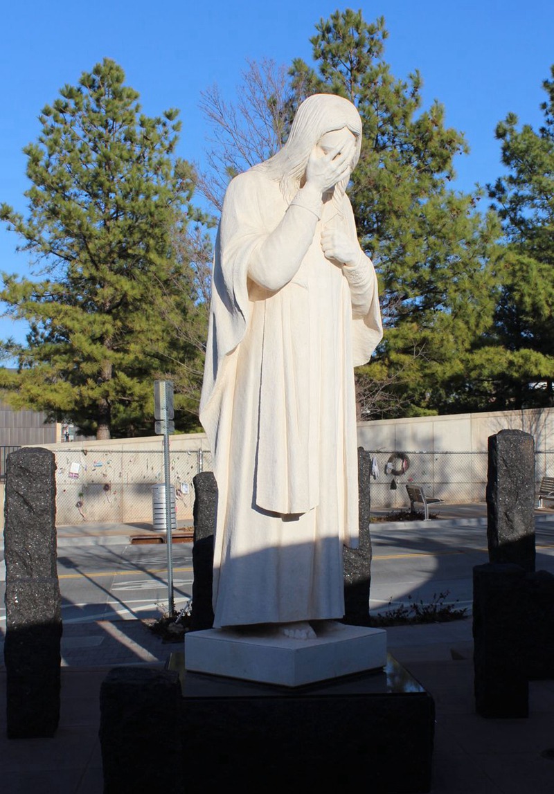 The “Weeping Jesus” statue stands across from the Oklahoma City National Memorial. Erected in remembrance of the Oklahoma City bombing, it portrays Jesus in sorrow, symbolizing the lives lost in the tragedy.