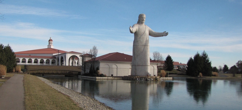 The “King of Kings” statue, known as “Touchdown Jesus,” was a 62-foot figure until it was destroyed in 2010. It was replaced by the “Lux Mundi” statue, symbolizing the light of the world.