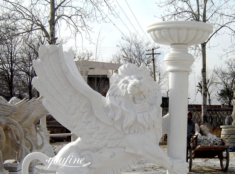 White Marble Winged Lion Statue with Planter for Front Porch MOKK-606